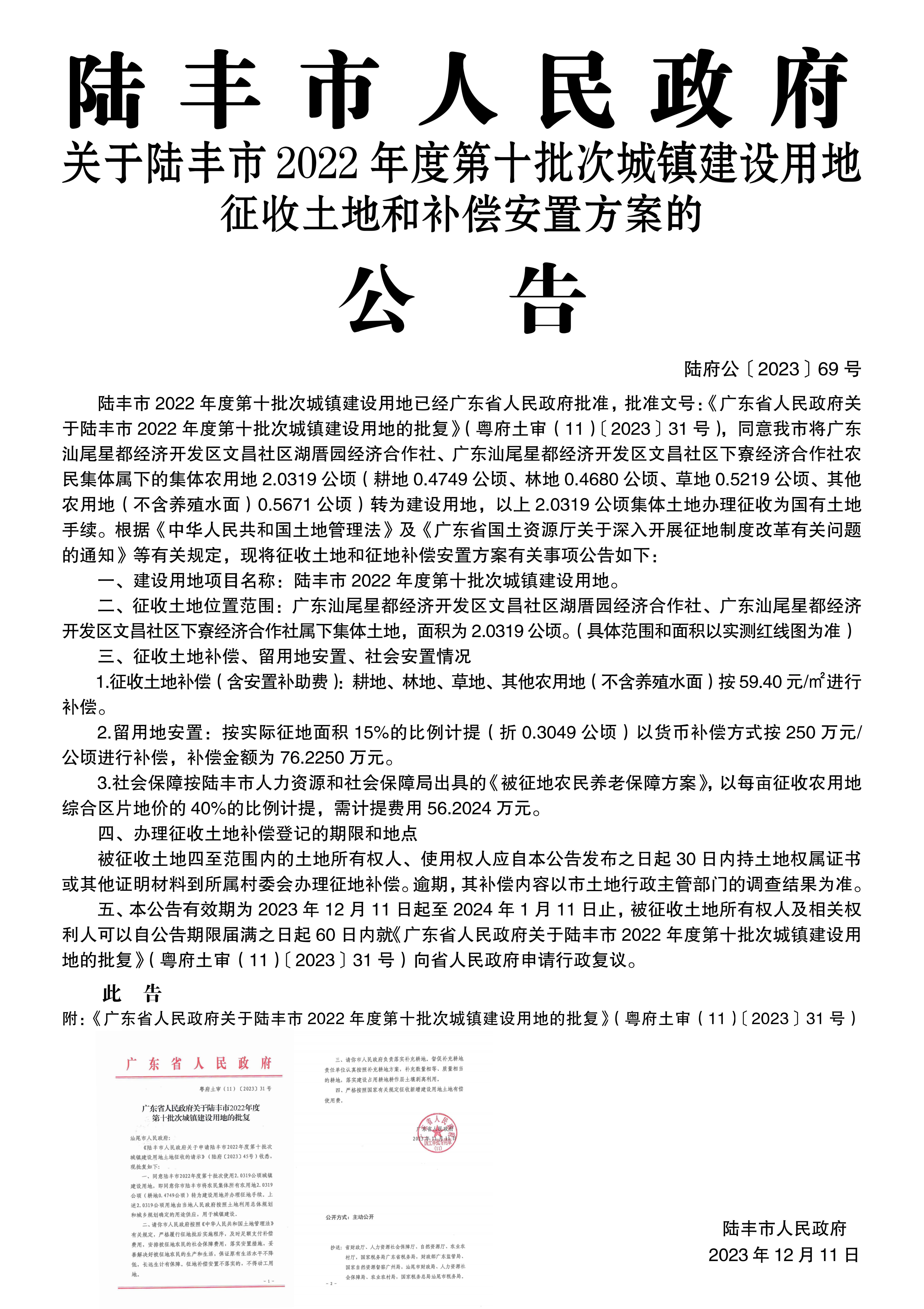 廣東省人民政府關(guān)于陸豐市 2022年度第十批次城鎮(zhèn)建設(shè)用地的批復(fù)(粵府土審(11)〔2023〕31號)