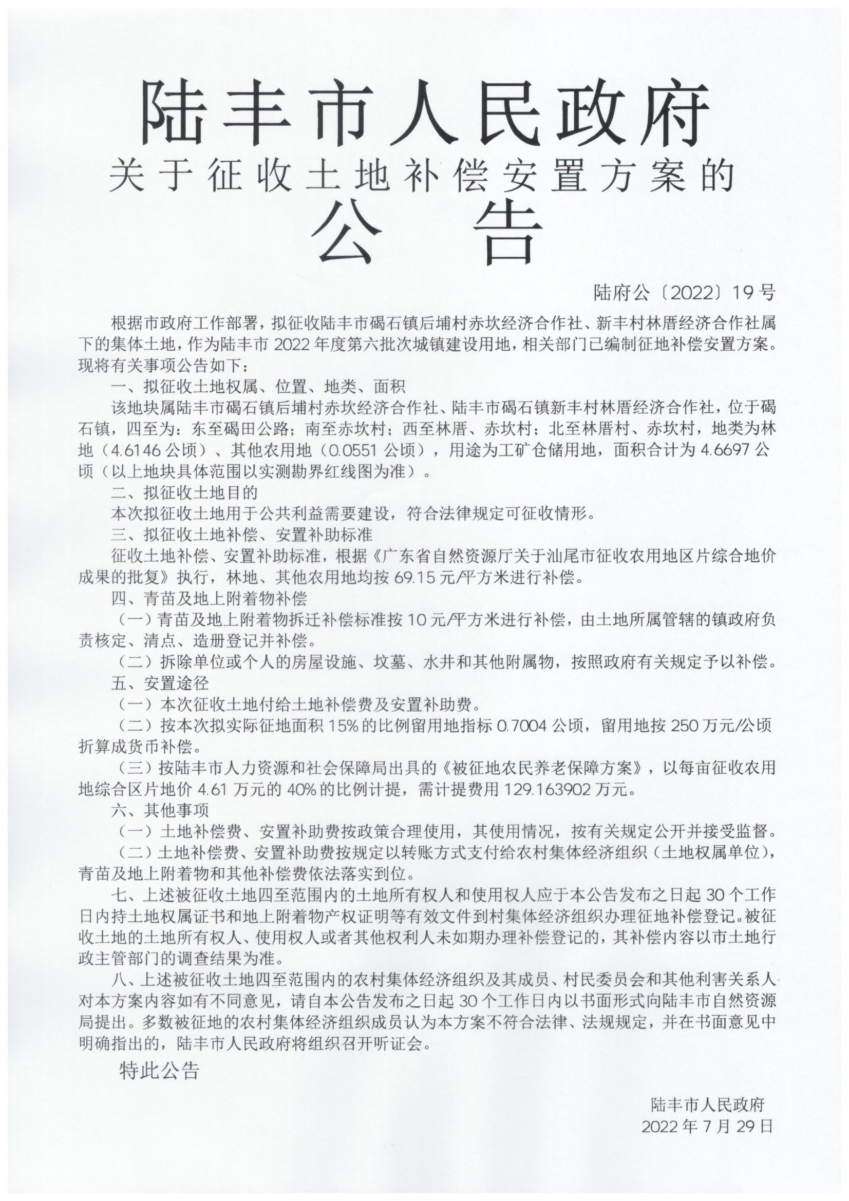 陸豐市人民政府關(guān)于征收土地補償安置方案的公告(陸府公[2022]19號)