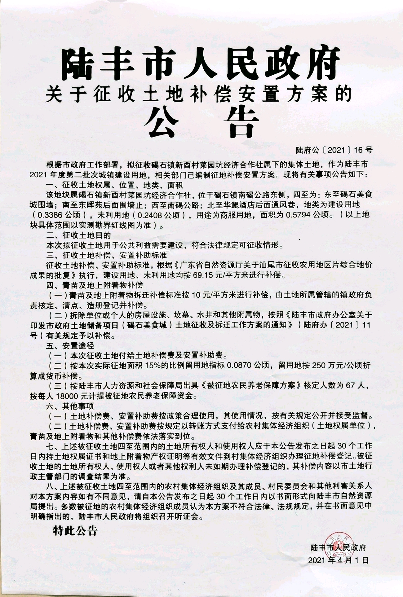 陸豐市人民政府關(guān)于征收土地補償安置方案的公告(陸府公[2021]16號)