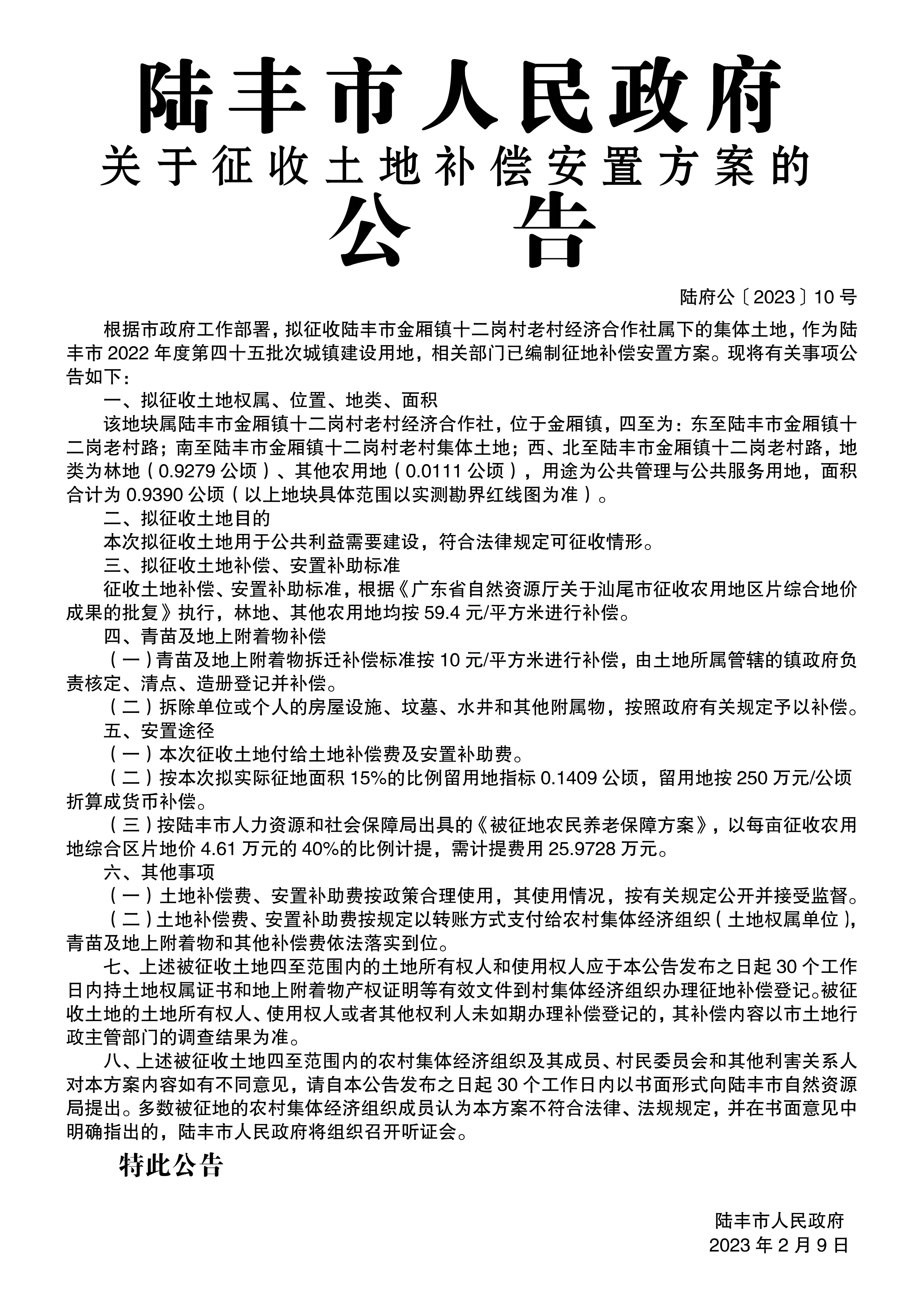 陸豐市人民政府關(guān)于征收土地補償安置方案的公告(陸府公〔2023〕10號)