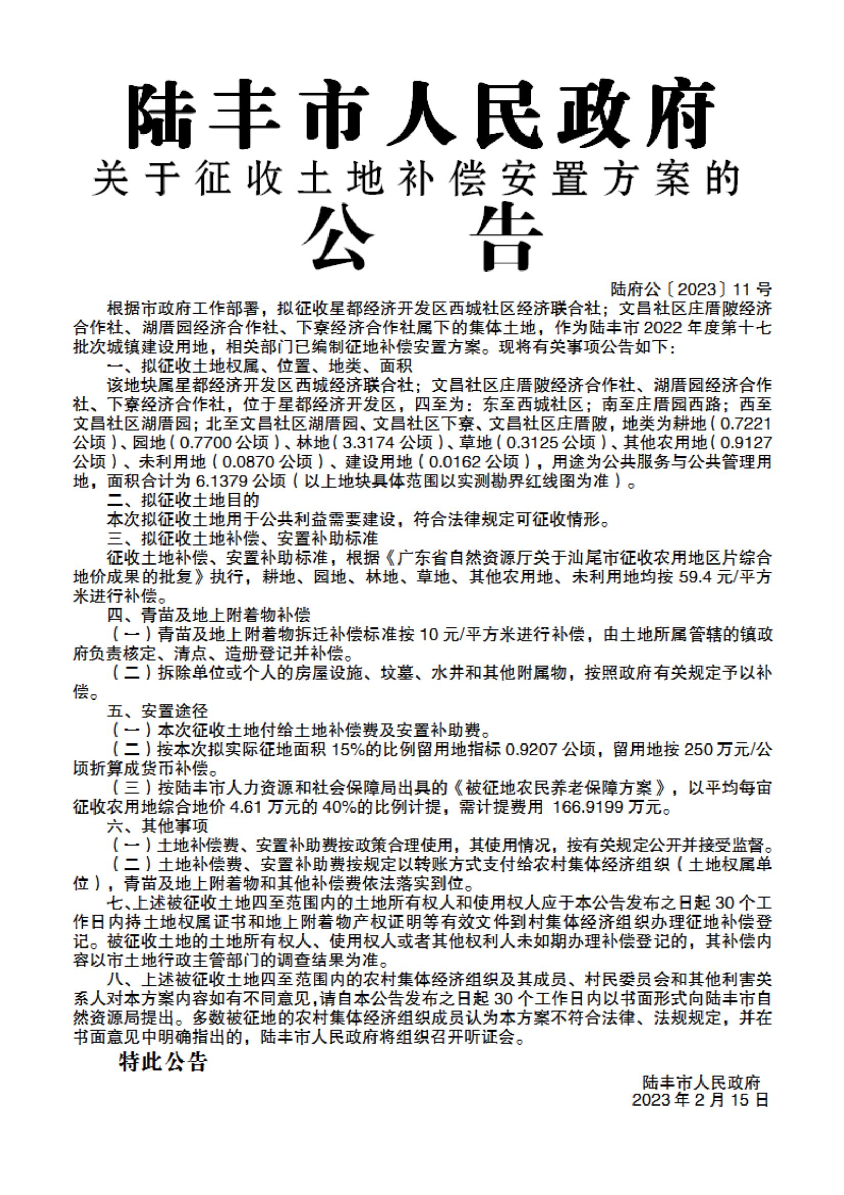 陸豐市人民政府關(guān)于征收土地補(bǔ)償安置方案的公告(陸府公〔2023〕11號(hào))