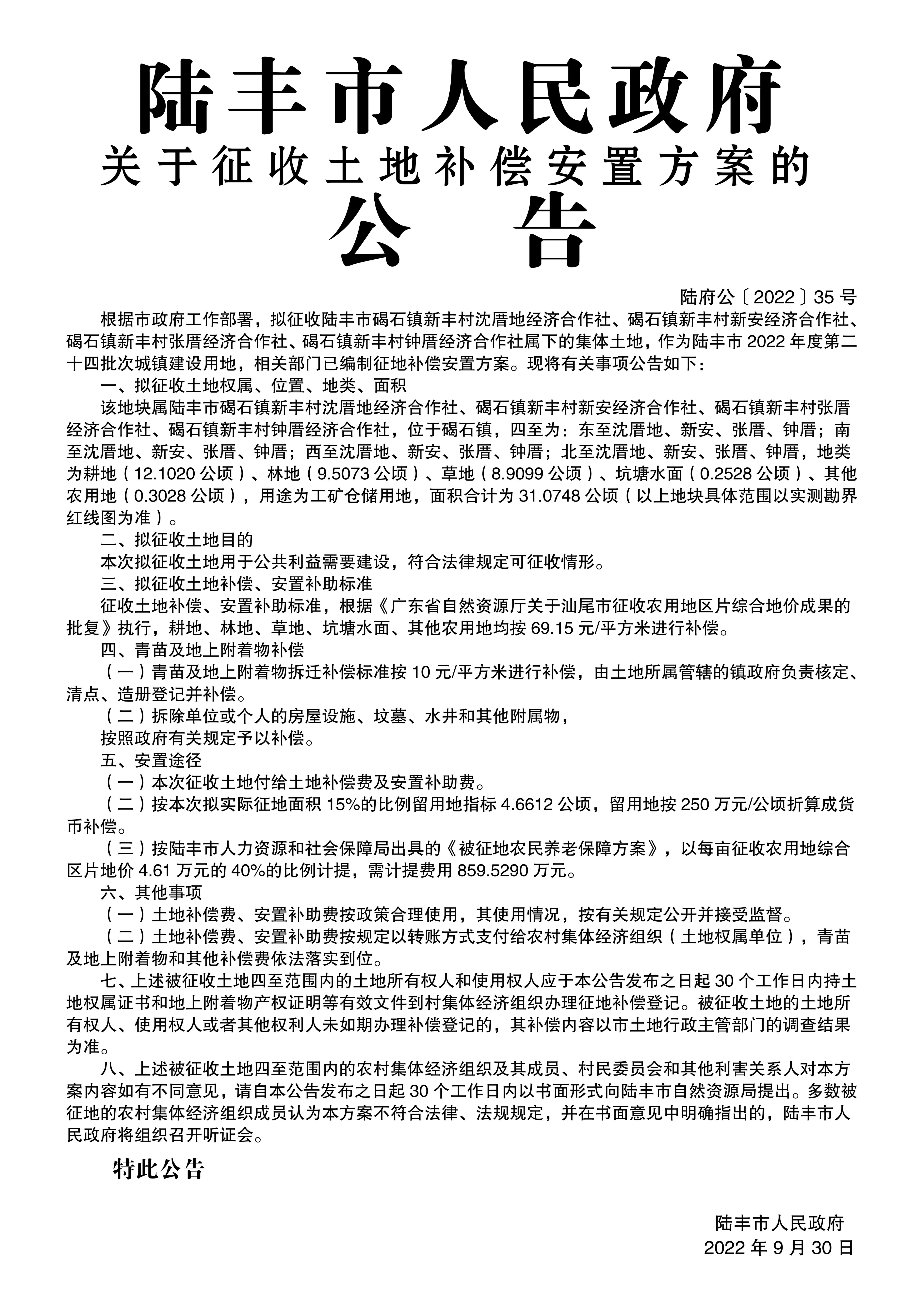 陸豐市人民政府關(guān)于征收土地和補(bǔ)償安置方案的公告(陸府公[2022]35號(hào))