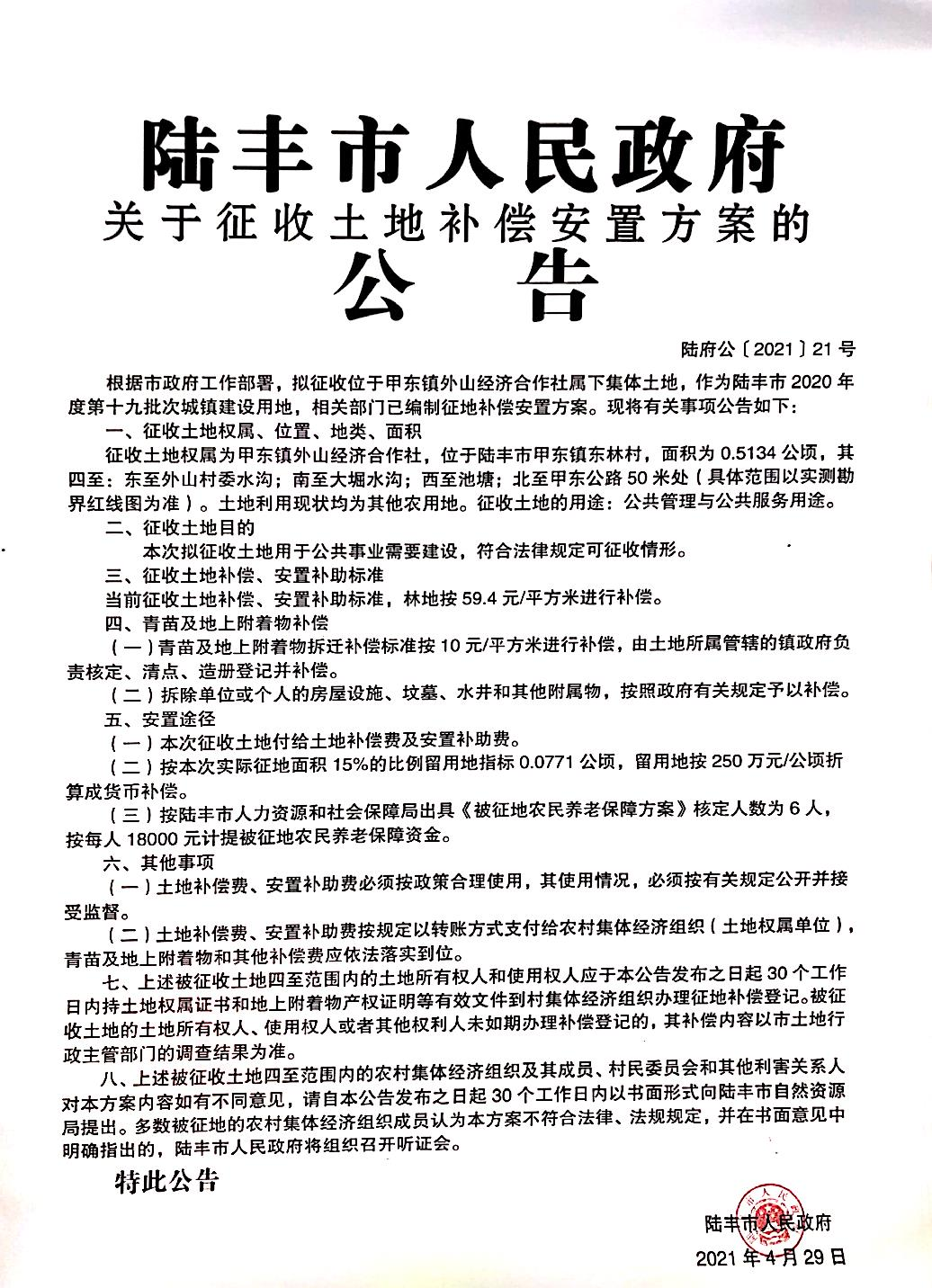 陸豐市人民政府關(guān)于征收土地補(bǔ)償安置方案的公告(陸府公[2021]21號(hào))