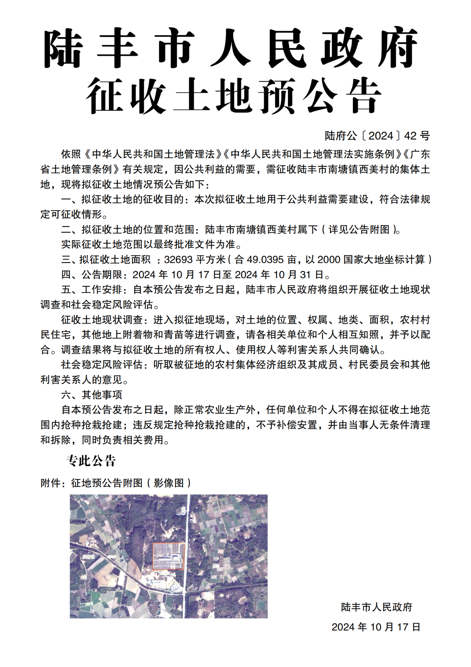 陸豐市人民政府征收土地預(yù)公告(陸府公〔2024〕42號(hào))