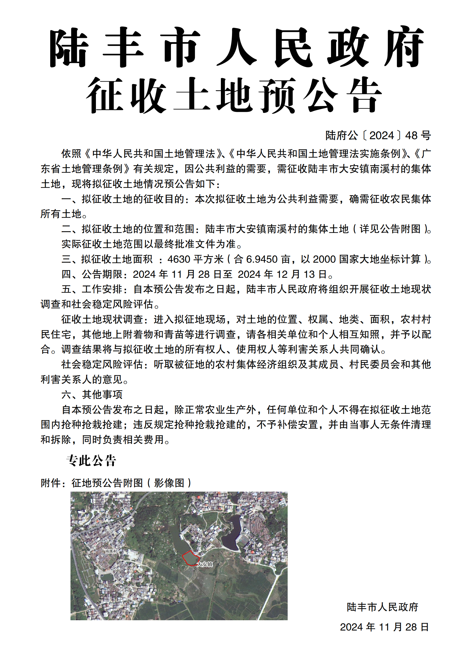 陸豐市人民政府關(guān)于征收土地預(yù)公告(陸府公〔2024〕48號)