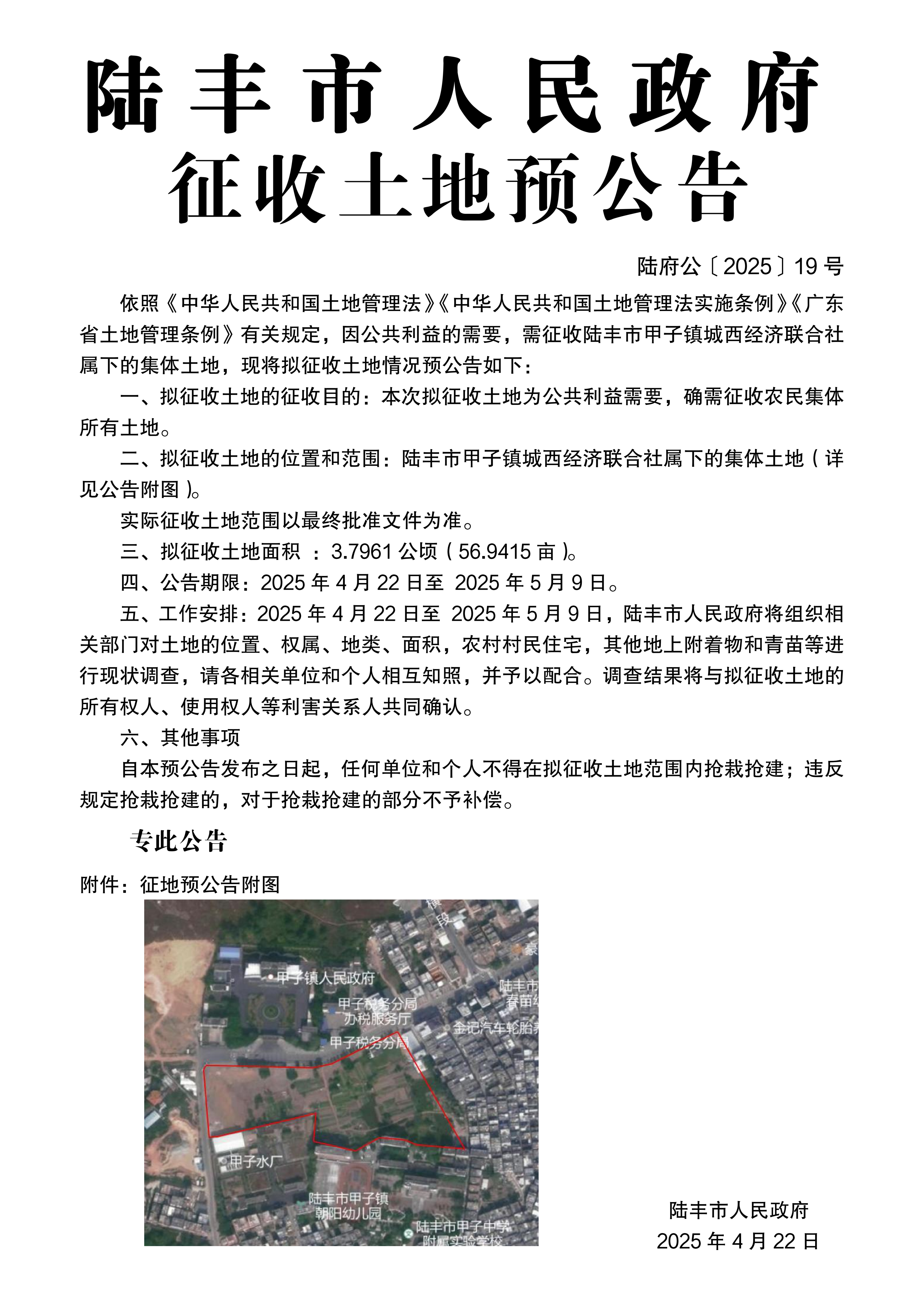 陸豐市人民政府征收土地預(yù)公告(陸府公〔2025〕19號(hào))