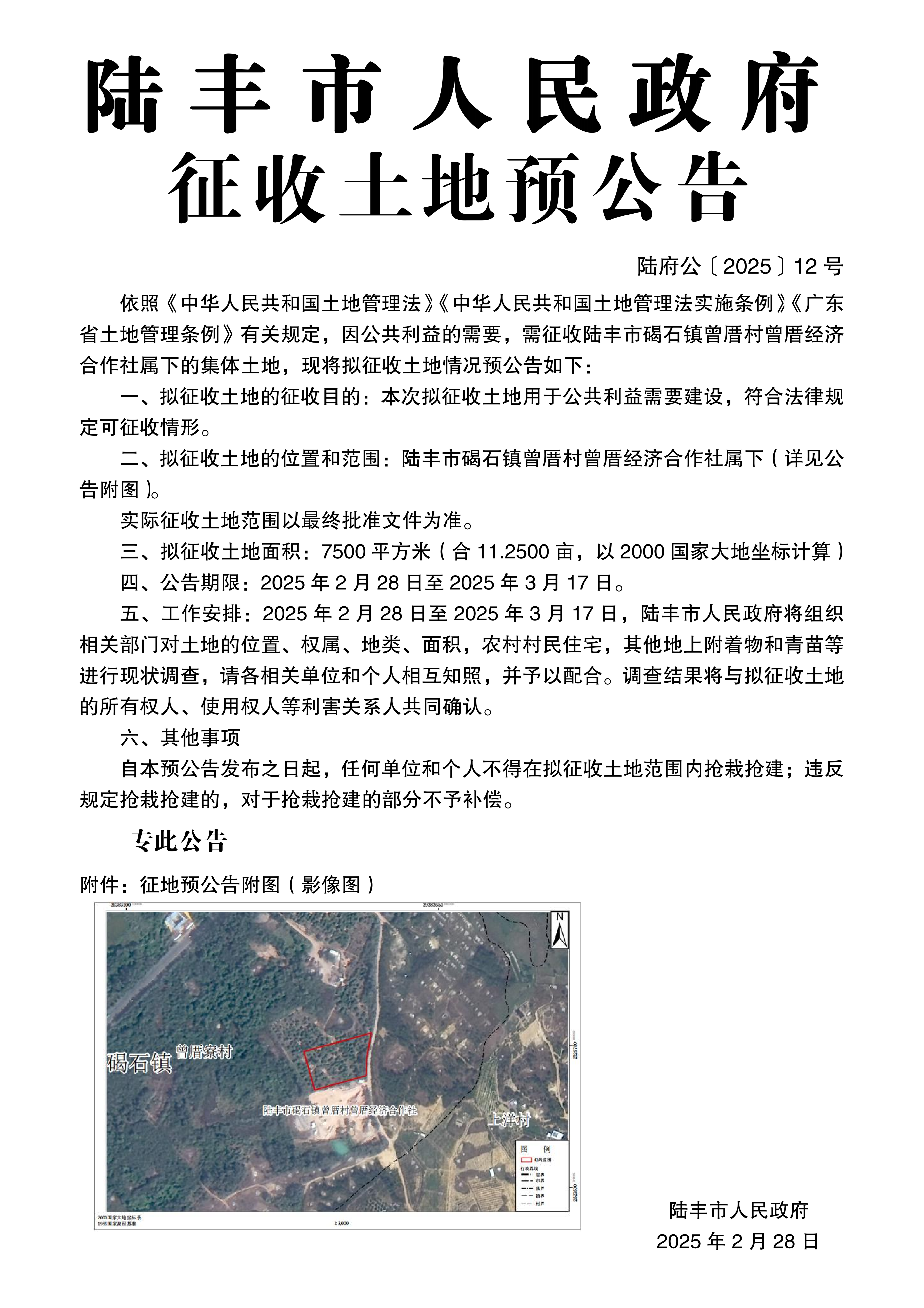 陸豐市人民政府征收土地預(yù)公告(陸府公〔2025〕12號(hào))