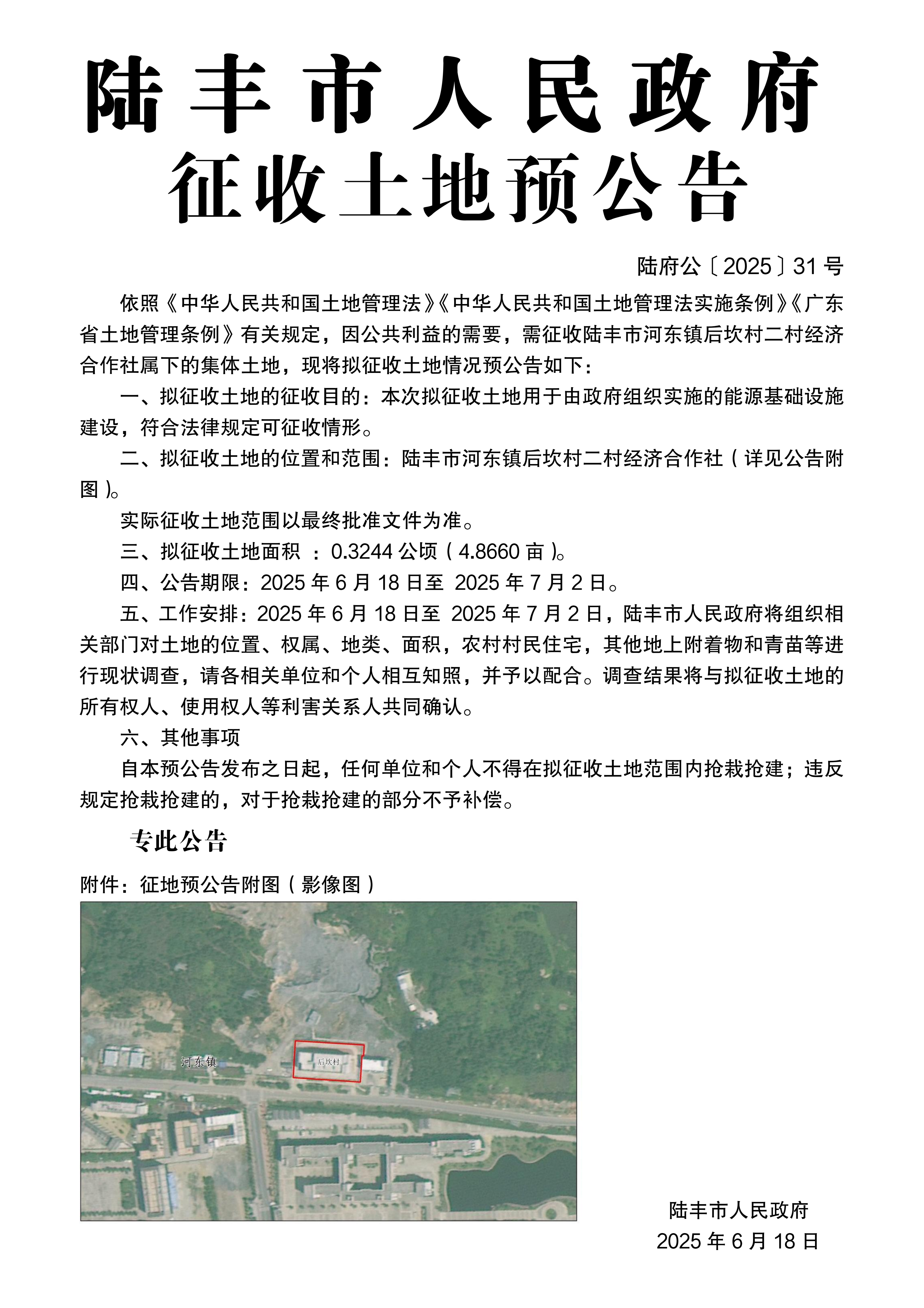 陸豐市人民政府關(guān)于征收土地預(yù)公告(陸府公〔2025〕31號(hào))