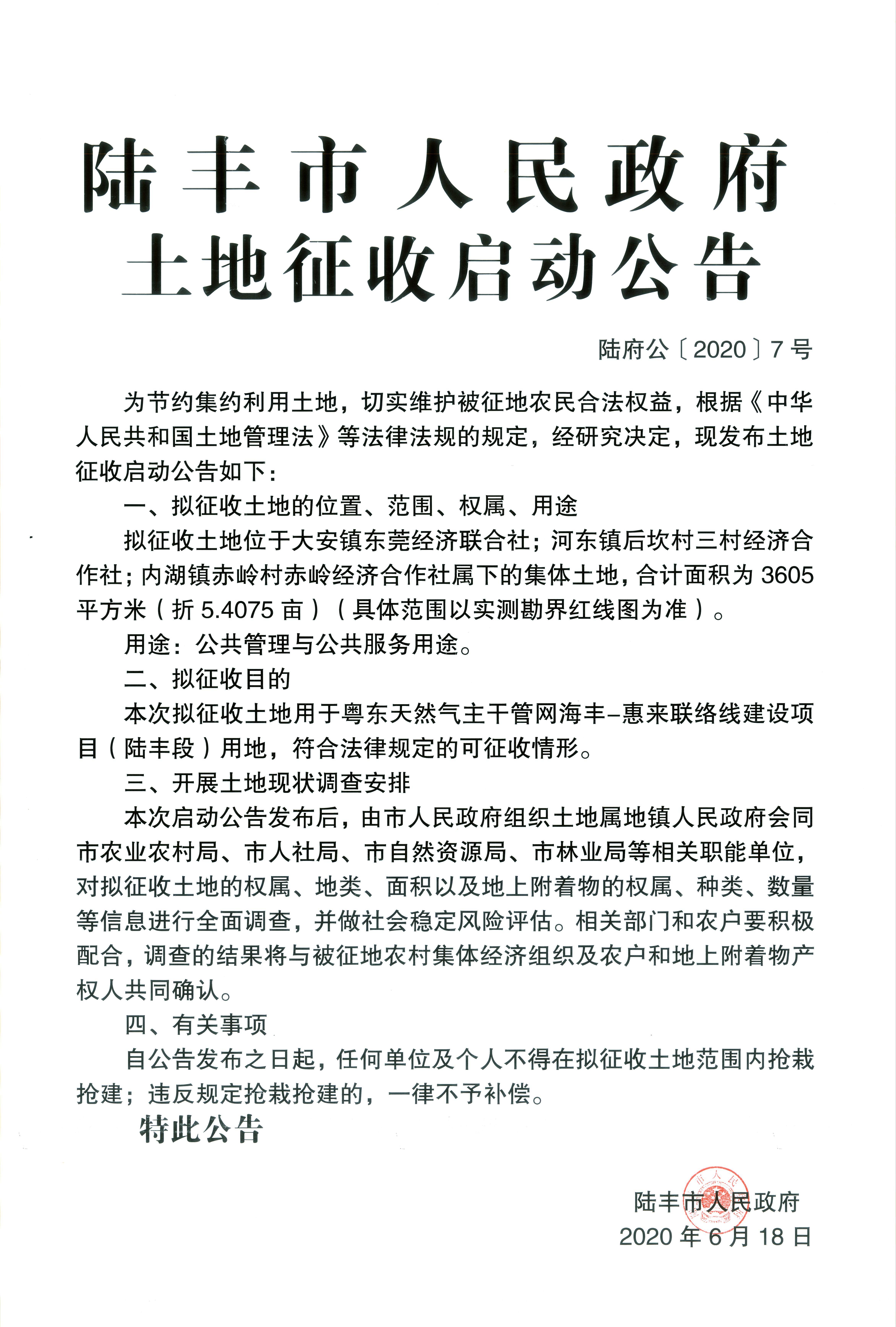陸豐市人民政府土地征收啟動公告(陸府公(2020)7號)