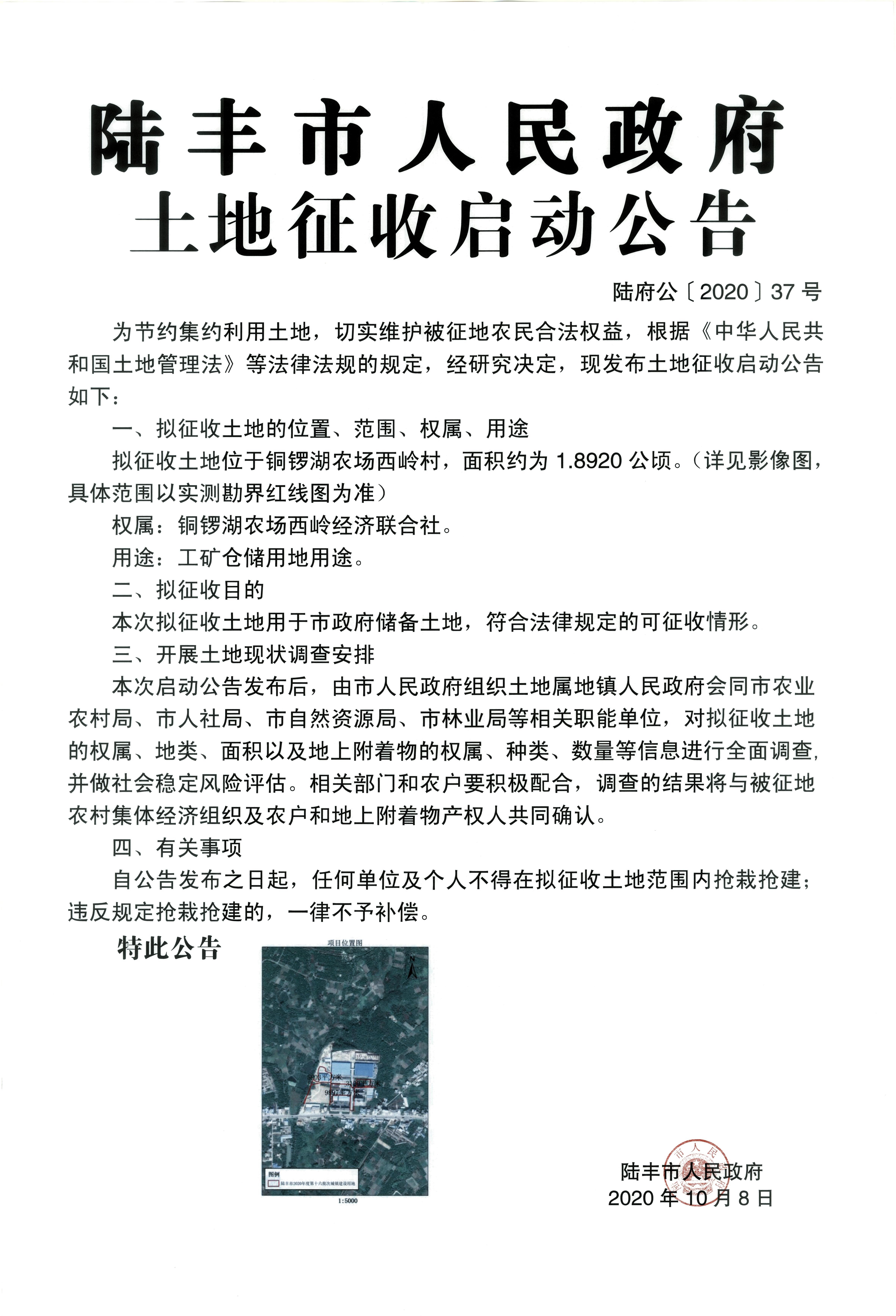 陸豐市人民政府土地征收啟動公告-陸府公(2020)37號