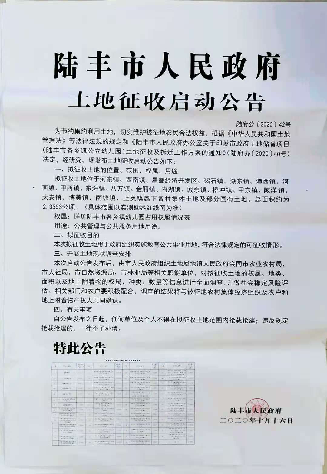 陸豐市人民政府土地征收啟動(dòng)公告-陸府公[2020]42號(hào)