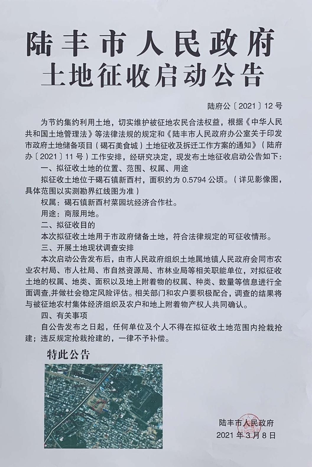 陸豐市人民政府土地征收啟動公告(陸府公[2021]12號)