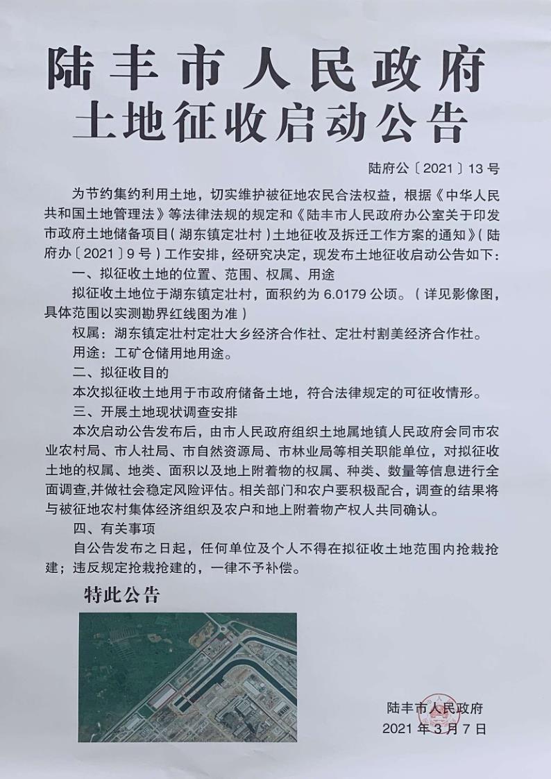陸豐市人民政府土地征收啟動公告(陸府公[2021]13號)
