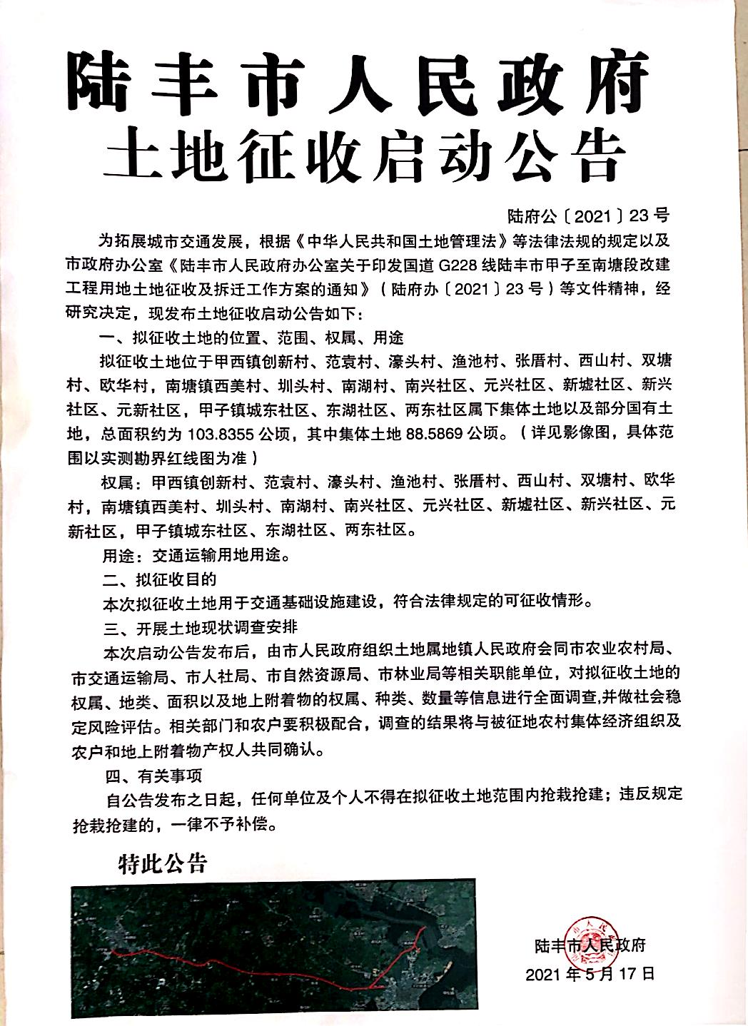 陸豐市人民政府土地征收啟動(dòng)公告(陸府公[2021]23號(hào))