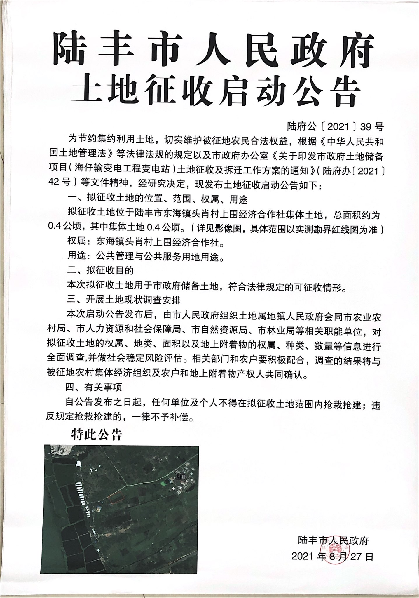 陸豐市人民政府土地征收啟動公告(陸府公[2021]39號)