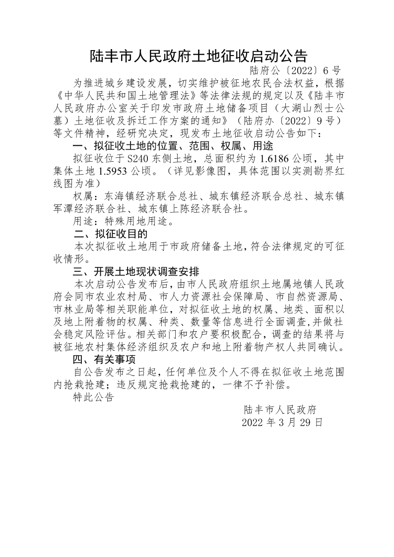 陸豐市人民政府土地征收啟動(dòng)公告(陸府公〔2022〕6 號(hào))