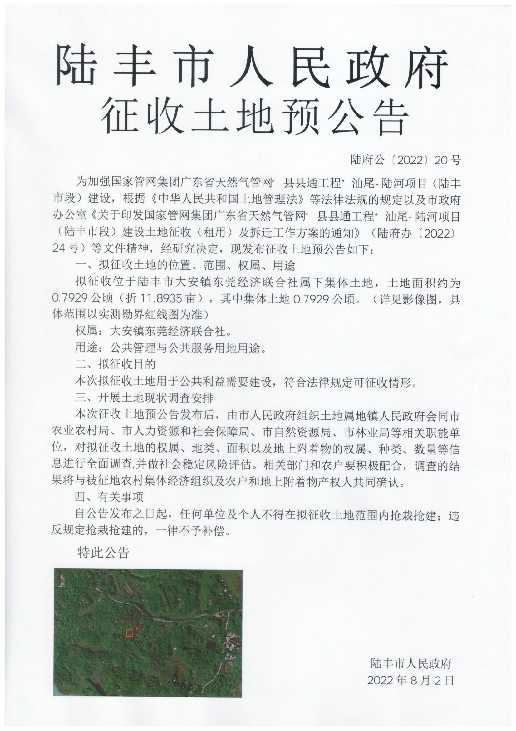 陸豐市人民政府征收土地預(yù)公告(陸府公[2022]20號(hào))