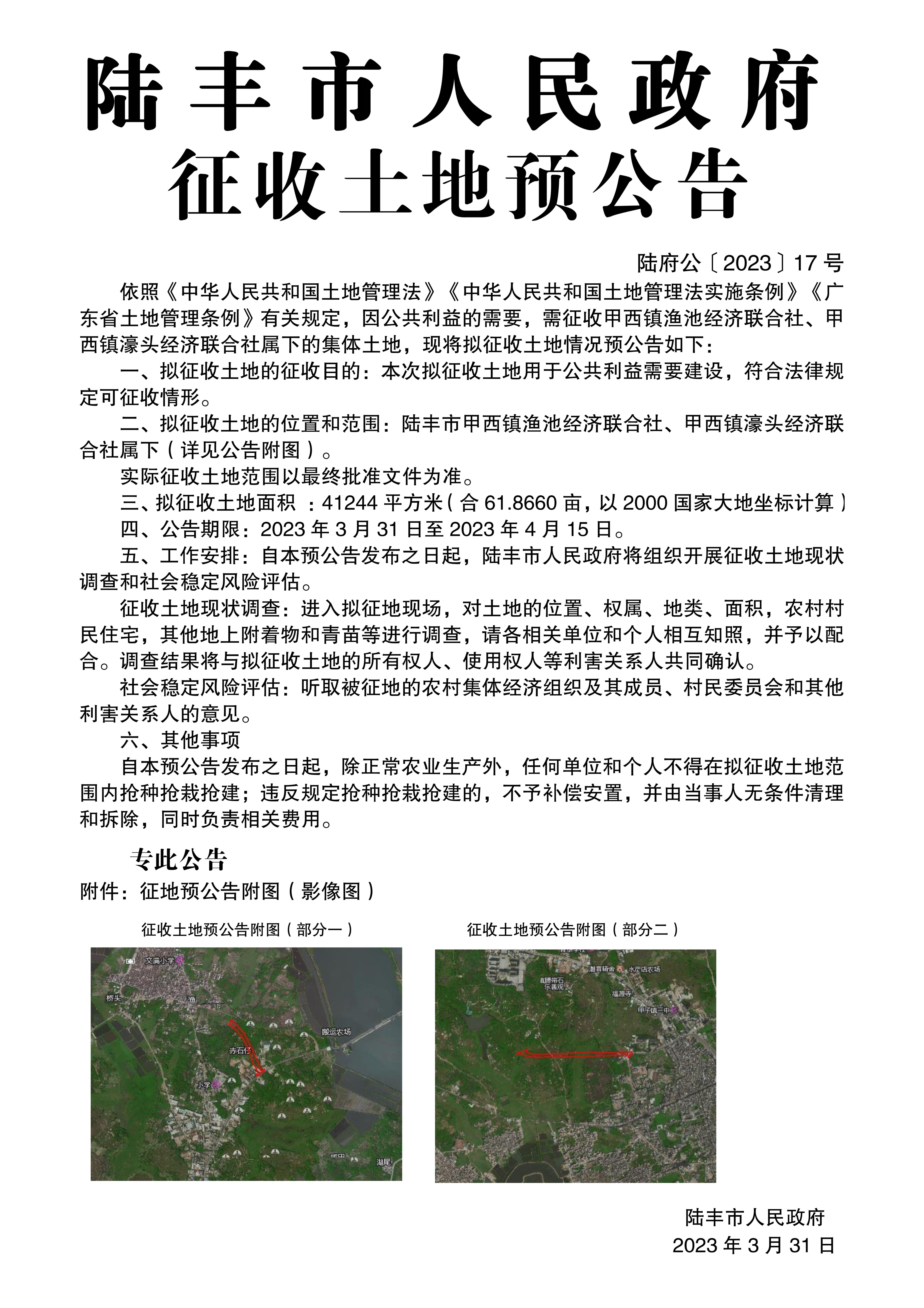 陸豐市人民政府征收土地預(yù)公告(陸府公〔2023〕17號(hào))