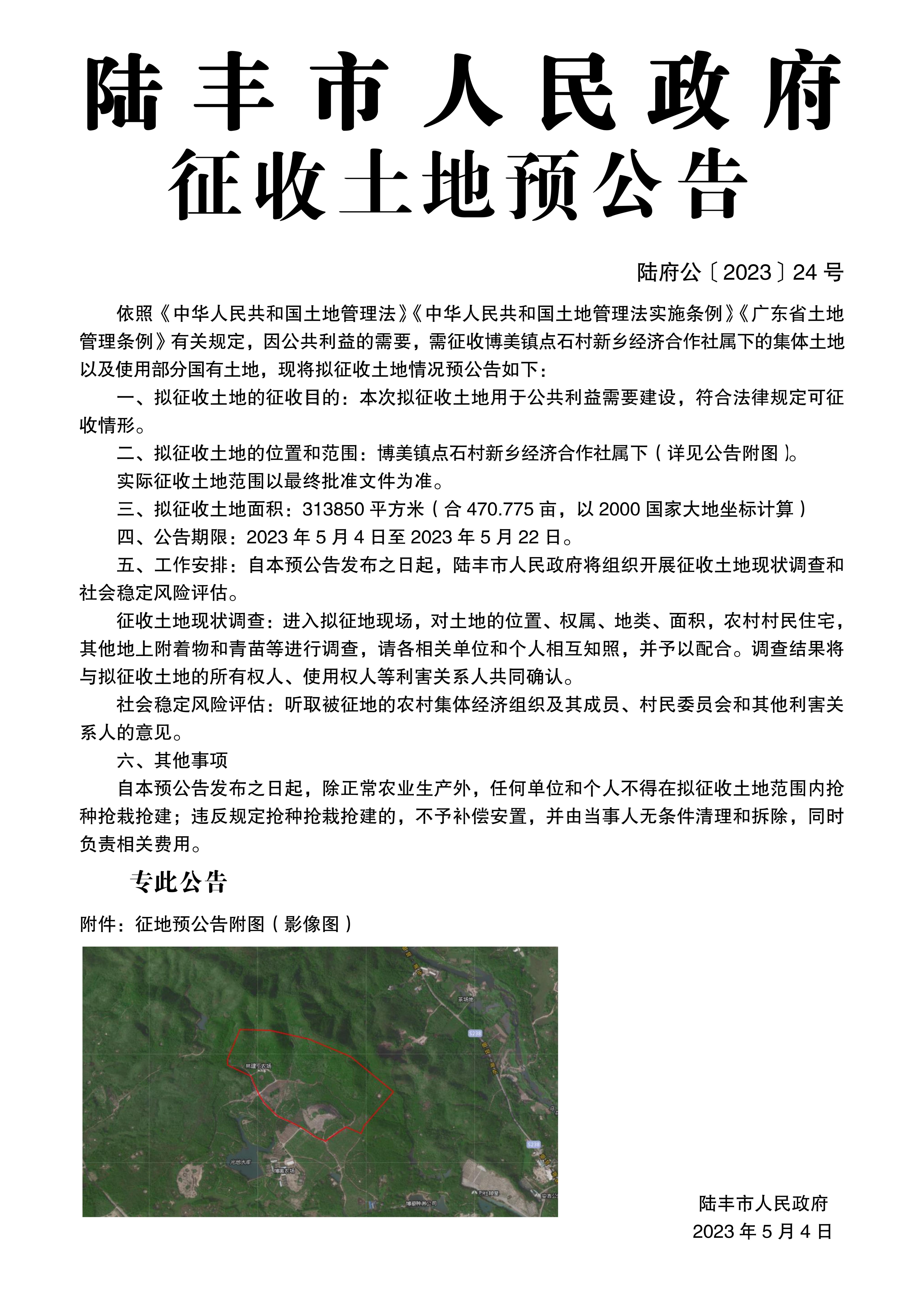 陸豐市人民政府征收土地預(yù)公告(陸府公〔2023〕24號)