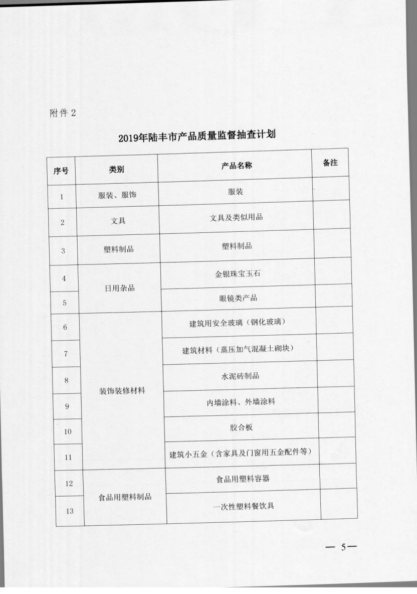 關(guān)于印發(fā)2019年陸豐市重點產(chǎn)品質(zhì)量監(jiān)管目錄和產(chǎn)品質(zhì)量監(jiān)督抽查計劃的通知