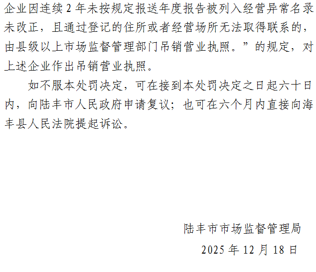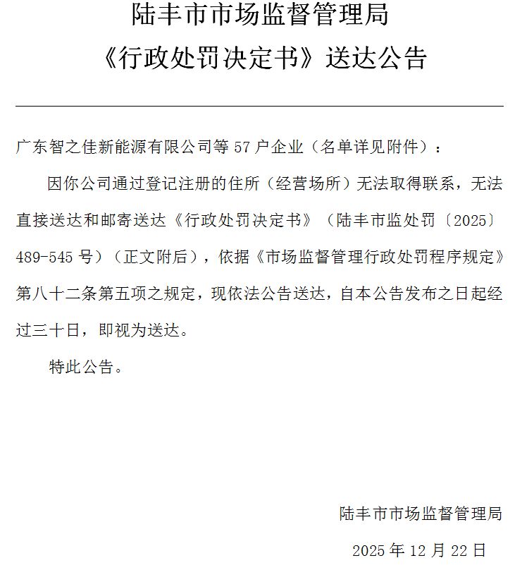 陸豐市市場(chǎng)監(jiān)督管理局《行政處罰決定書(shū)》送達(dá)公告