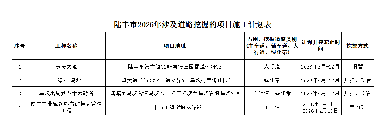陸豐市2026年涉及道路挖掘的項(xiàng)目施工計(jì)劃表
